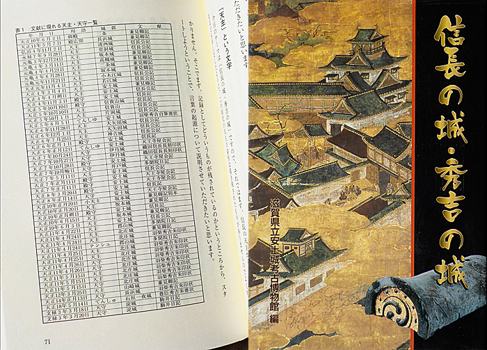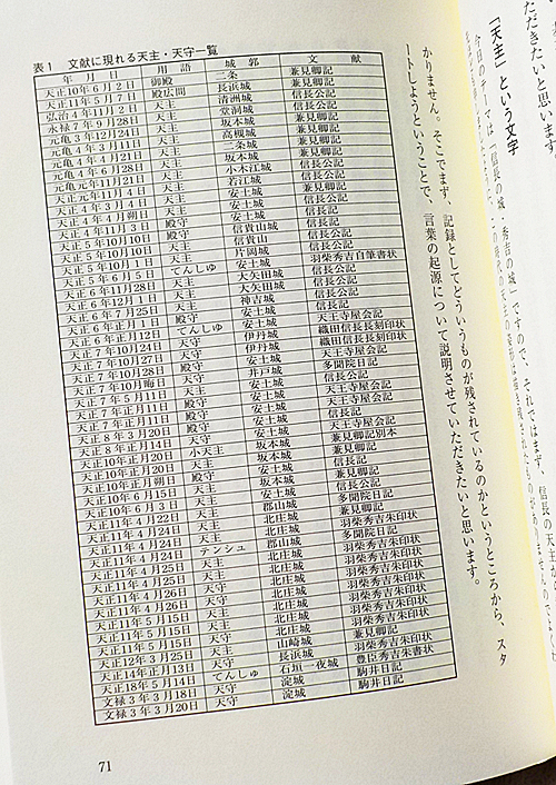 そこで、ここからは、考えを進める手がかりとしまして、かつて木戸雅寿先生が平成18年のシンポジウム講演の採録「天主から天守へ」(上記『信長の城・秀吉の城』所収)に掲載された「文献に現れる天主・天守一覧」表が、たいへん参考になりまして、今回の記事ではこれを大いに参照させていただくことにします。