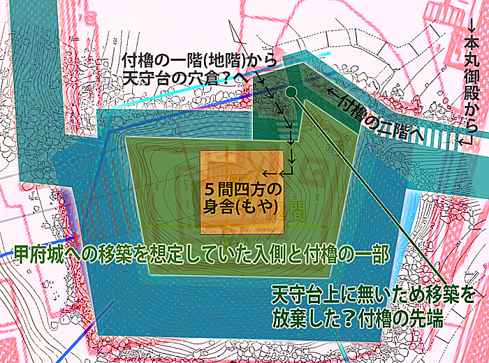ご覧のとおり「5間四方の…」は甲府城の穴倉をおおうサイズとして適当な大きさですから、きっと穴倉の内部には天守一階を支える柱等を建て込みつつ、その上に移築専用天守の身舎を組み上げて、周囲には(それまでの通例とは異なって)石垣山城天守の「入側」部分もそっくりそのまま移築させようとした?…と考えても、構造的には何ら無理は無かったはず、と申し上げて良い状況ではないでしょうか。