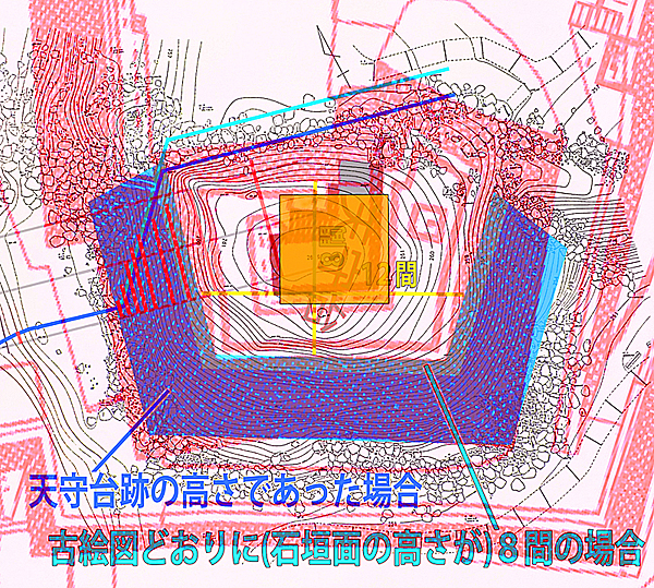 このように両天守台の台上は同一のもの、と言っても過言ではないほど、形も広さも良く似ておりまして、ためしに例の「移築専用天守の5間四方の身舎(もや)」=下記の黄土色の四角部分を重ねてみれば…