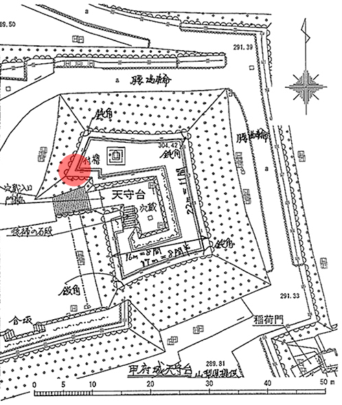 どういうことかと申せば、考え方のポイントは、下記の写真や図にある「甲府城天守台のちょっと異様な鋭角の隅角」がどうして出来たか、を想像してみることであり、これが逆算の出発点になります。