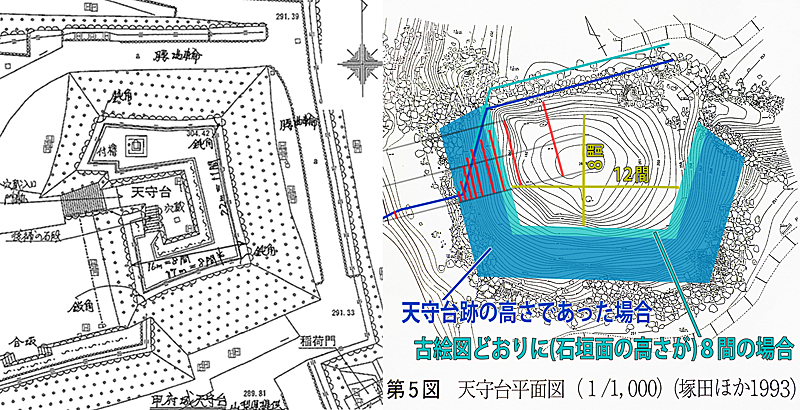 !!……… この同縮尺の比較図をご覧いただいただけで、即座に、とてつもない、この上なく重大な事柄に…お気づきになられたのではないでしょうか。(※とりわけ石垣山城天守台の北東隅の妙な石垣跡の形状!…)