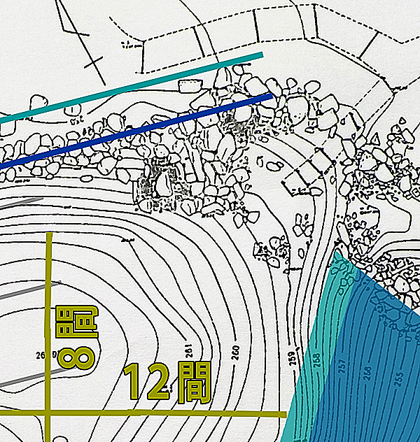 この崩壊した石垣跡をジッと見つめていますと、ここは甲府城の天守台と同様に、付櫓の類いが突出していた痕跡であろう、と思えて来るのですが、さらに周囲の石垣との関連性を考えれば、ここにはおそらく部分的に二段式の石垣が築かれていて、甲府城への“そのまま移築”を本当だとするなら、例えば、下記のような石垣山城天守台の全体像(青緑で図示)も見えて来ると思うのですが、いかがお感じでしょう。