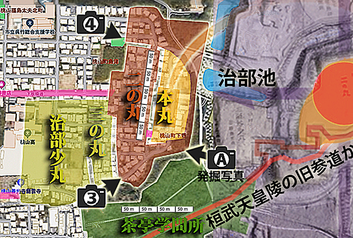 ( 当サイトが申し上げて来た指月伏見城の中枢部分は、惣構えの中心点に計画されたもので、舟入堀の奥正面には天守が見え、すぐ東隣りには桓武天皇陵が位置していた… )