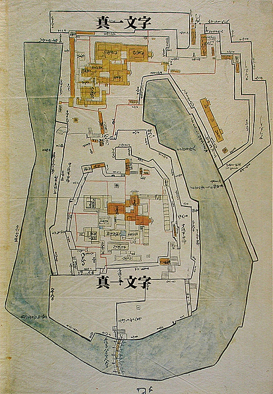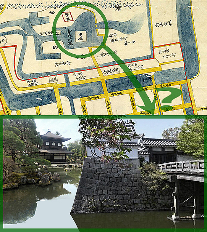 → → → もしかすると、「中嶋」とある四角い部分だけが石垣造りの「本丸」であって、実際は絵図よりもずっと大きいもので、その周囲には、舟入堀と直結した蔵屋敷や池泉回遊式庭園の楼閣=「天守跡」などが巧みに配置されていて、要するに、これらは織田信長の岐阜城の川沿いの船着き場から昔御殿や千畳敷(信長居館)の庭園までを、この場でいっぺんに、模倣(もほう)して再現しようとしたのではなかったか、と。