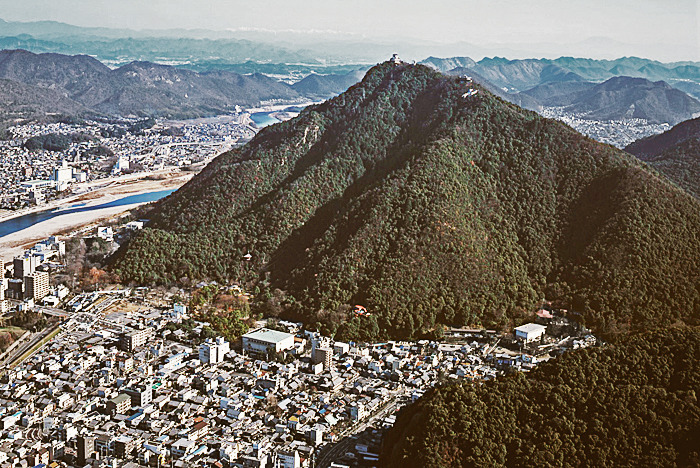 そしてここで最も重要な「金華山山頂の主郭」は、実際に旧城下町の真ん中あたりから見上げますと、金華山がまるで「巨大な屏風を立て並べた」ように見えるため、主郭等々の建物はその屏風の上辺に「真一文字に」並んで見えたはずであり、これこそが、秀吉のあこがれた(そして長浜での再現にチャレンジした)城郭の景観だったのではないでしょうか。
