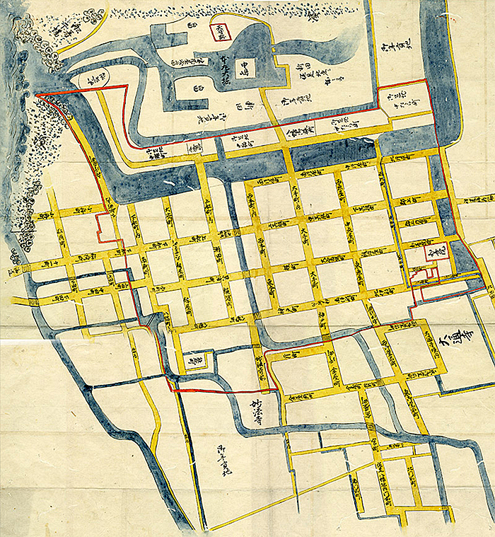 城と正対した城下町の碁盤目状の造りがみごとなのに対して、