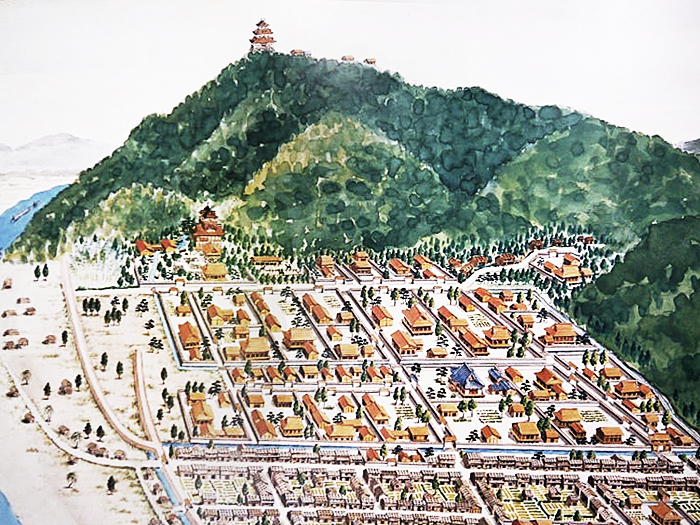 織田信長の岐阜城の<金華山頂の主郭&居館の庭園&碁盤目状の城下>を