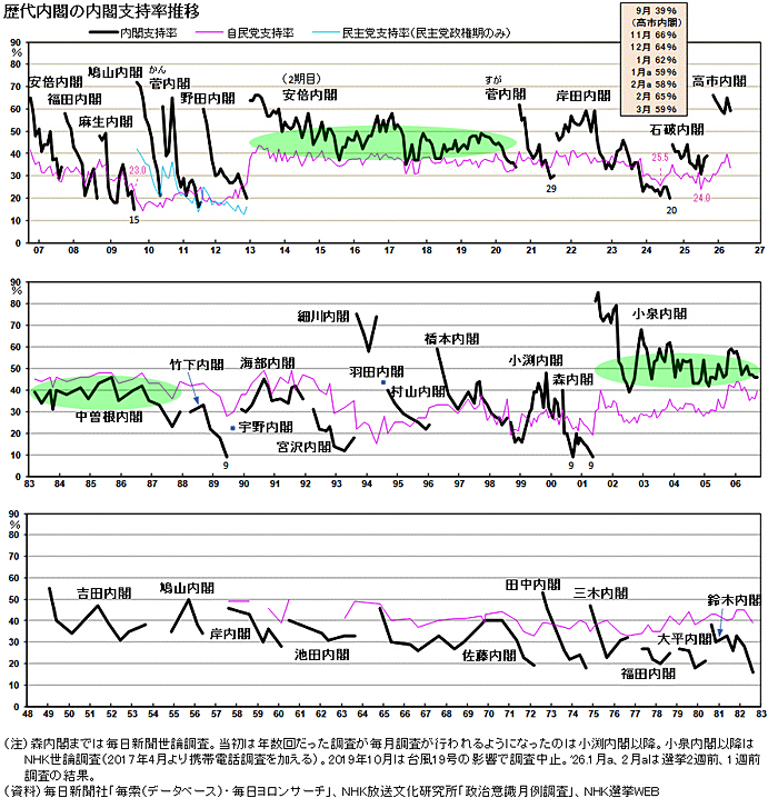 ここでためしに、サイト「図録▽歴代内閣の内閣支持率推移」様の有名なグラフに着色をさせていただきました。 これで明らかなのは…