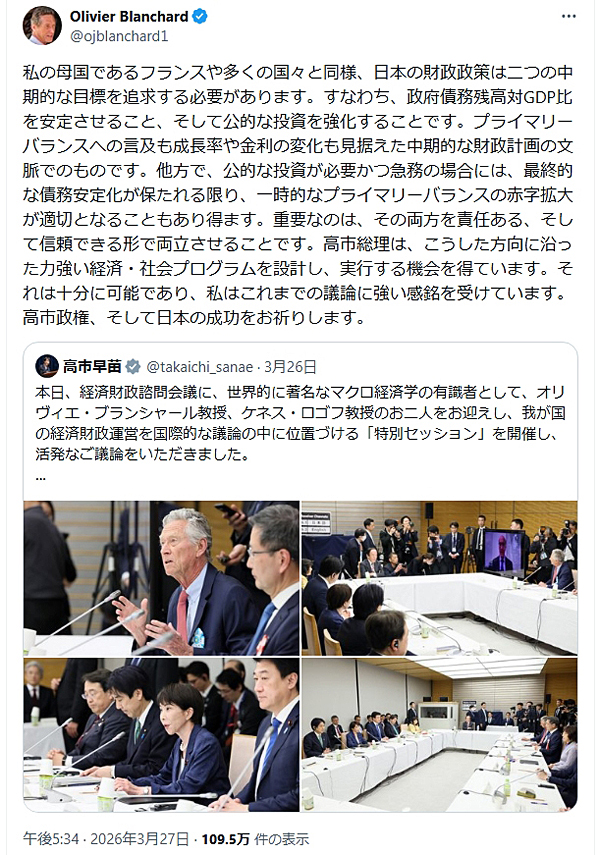 【 高市さんの積極財政を支持するブランシャール教授が、財務省や日経新聞に対して怒りのX投稿!…だそうで。】
